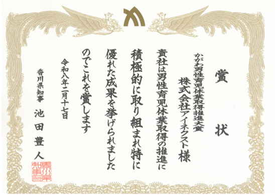 この度、株式会社アイネクストは、香川県が主催する「令和7年度 かがわ男性育児休業取得推進大賞」を受賞いたしました。